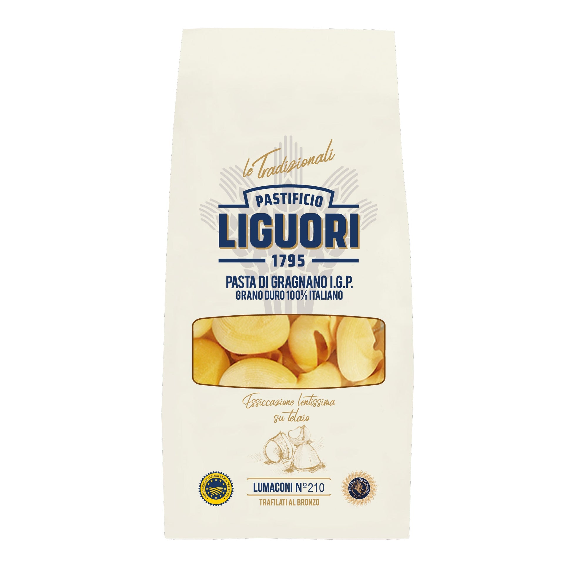 Pâtes de Gragnano IGP à base de semoule de blé dur 100% italienne.