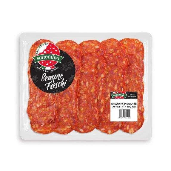 Une charcuterie de caractère venue tout droit du sud de l’Italie ! La spianata piquante SORRENTINO séduit par sa forme plate, sa texture fondante et son goût relevé grâce au piment soigneusement dosé. Tranchée finement, elle est parfaite pour apporter une touche épicée à vos apéritifs, pizzas ou panini.
